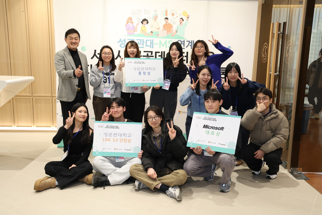 이번 대회에서는 ▲1등‘은퇴한 시니어를 위한 구인구직 플랫폼’ 성균관대 총장상 ▲2등 ‘지역주택조합 안전 가입을 위한 대시보드’ 한국마이크로소프트 대표상 ▲3등 ‘비상구 및 대피소 지정 서비스’ LINC 3.0 단장상이 수여됐다,