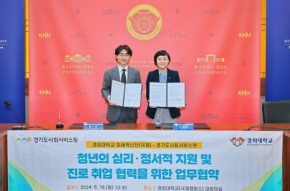 경희대 국제캠퍼스 미래혁신단과 경기도사회서비스원이 청년의 심리????정서적 지원 및 진로 취업 협력을 위한 업무협약을 18일 체결했다. 왼쪽부터 경희대 국제캠퍼스 미래혁신단 황수현 단장, 경기도사회서비스원 안혜영 원장. 사진=경희대 제공 |