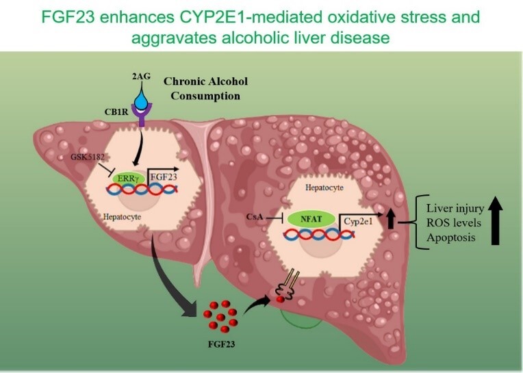연구팀에 따르면, 사람이 알코올을 섭취하면 간 세포막에 존재하는 ‘CB1’ 수용체가 활성화되고, 여러 가지 세포 신호전달 과정을 거치면서 ‘ERRγ’에 의해 증가한 ‘FGF23’란 호르몬의 분비로 인해 간 손상이 촉진된다.
