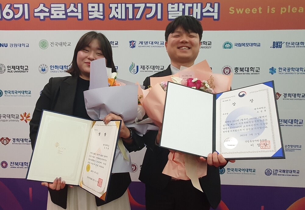 | 광주대 김은솔·오성훈 학생이 산업통상자원부 장관상과 한국무역협회장상을 수상한 후 기념촬영하고있다. 사진= 광주대 제공 |