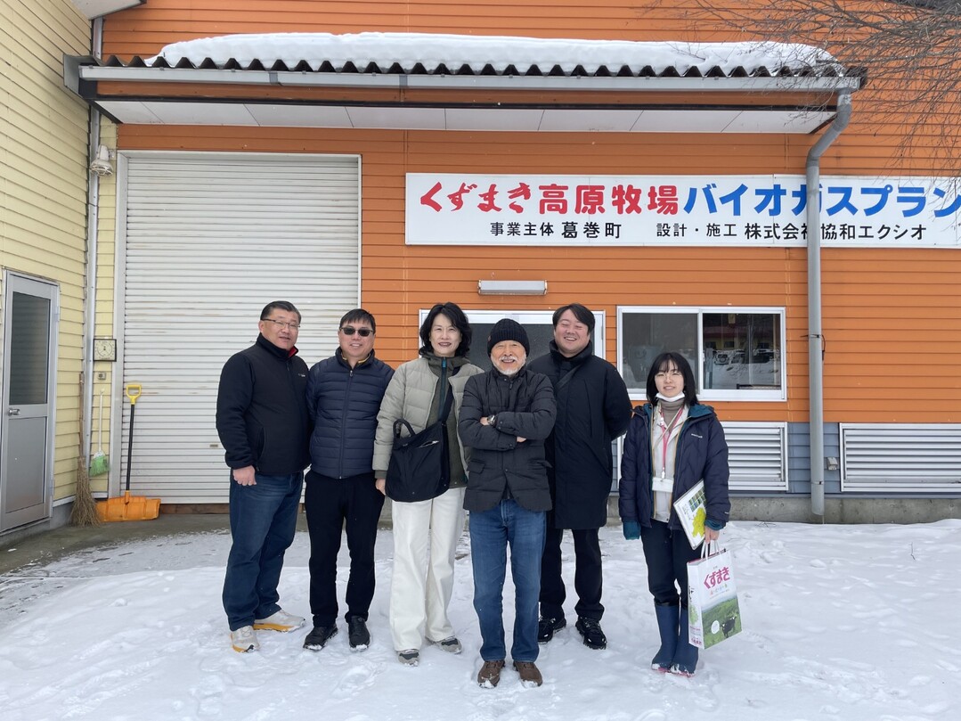 동신대 이주희(왼쪽 세 번째) 총장 등이 일본 이와테현의 에너지 자립마을인 구즈마키를 방문해 ‘바이오가스 플랜트’ 시설 등을 돌아보고 기념 촬영을 하고 있다. 사진=동신대 제공 |