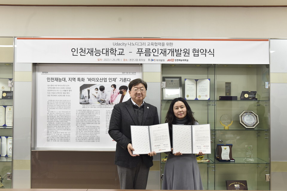 [대학저널 온종림 기자] 인천재능대학교는 지난 26일 유다시티 한국 독점 파트너인 푸름인재개발원과 글로벌 IT 전문가 인재양성을 위한 업무협약을 체결했다고 27일 밝혔다.