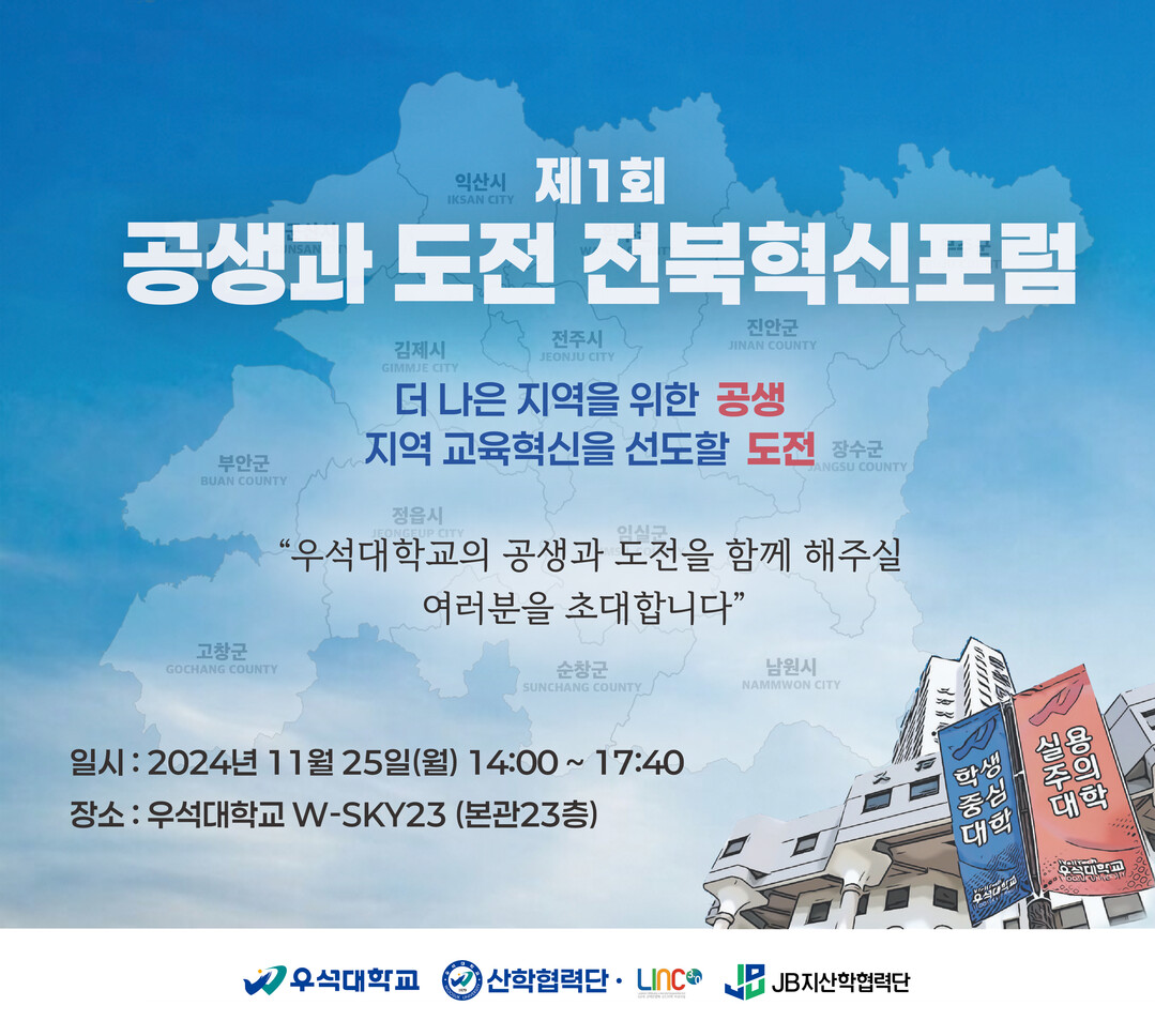 ‘RISE! 지역 혁신을 위한 공생과 도전’을 주제로 열리는 이번 포럼은 우석대학교가 주최하며, JB지산학협력단과 우석대학교 산학협력단·LINC 3.0 사업단이 공동 주관한다.