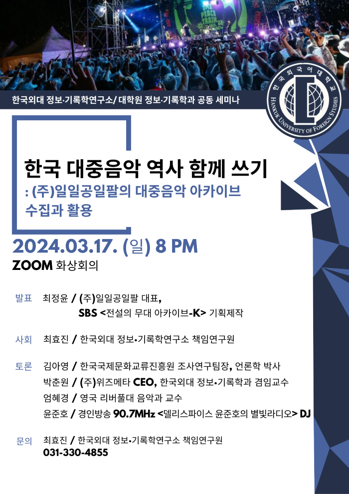 노명환 한국외대 정보·기록학연구소장은 “공공역사(Public History)의 관점에서 한국 대중음악과 관련한 기록을 어떻게 수집하고 해석하는지, 대중음악 제작과 수용의 역사를 어떻게 집필할 수 있을지 논의하는 자리가 될 것”이라고 전했다.