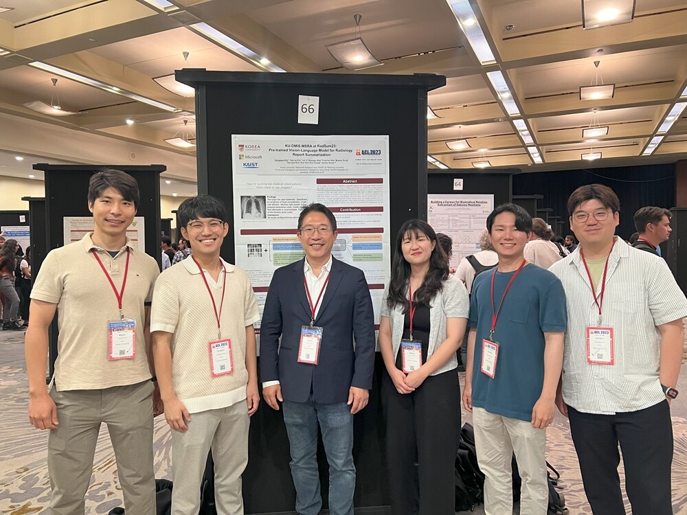 RadSum 대회 1위를 차지한 고려대 컴퓨터학과 연구팀. 왼쪽부터 성무진 석박사통합과정, 김강우 석박사통합과정, 강재우 교수, 김하정 석사과정, 김찬휘 석사과정, 김현재 박사과정. 사진=고려대 제공 |