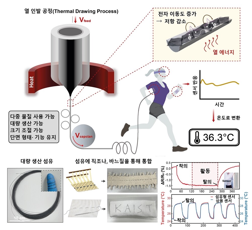 이후 연구팀은 큰 구조체에 열을 가하면서 당기면 크기가 줄어들며 섬유 형태로 변하는 열인발공정을 이용해서, 얇고, 유연하며, 물리/화학적 안정성이 높은 섬유형 온도 센서를 수백 미터 길이로 대량 생산하는 데 성공했다.