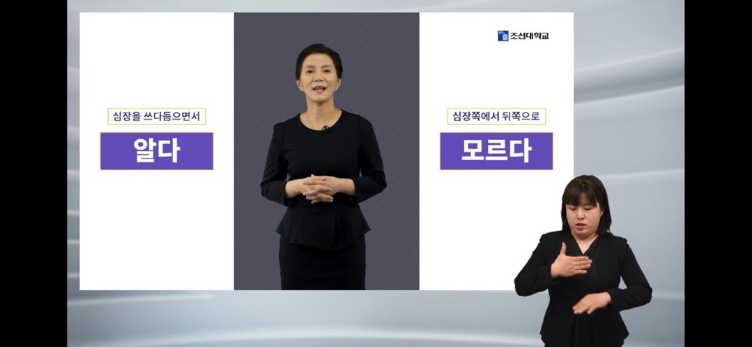 [대학저널 온종림 기자] 조선대학교 글로벌인문대학 최영주 교수가 개설한 ‘손생님! 한국수어를 부탁해요’ 강좌가 예비 수어 통역사와 현직 수어통역사들 사이에서 인기다. 지난 2021년 3월 개강한 수어강좌는 2021년 호남권 대학 중 유일하게 선정된 한국형 온라인 공개 묶음강좌(K-MOOC)이다.