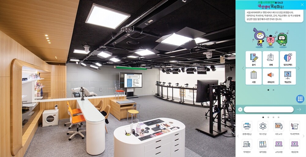 ‘실감형 콘텐츠 제작 시스템(VX, Virtual eXperience)'이 구축된 서울사이버대의 아트 테크 스튜디오(ART TECH STUDIO)와 AI 챗봇. |