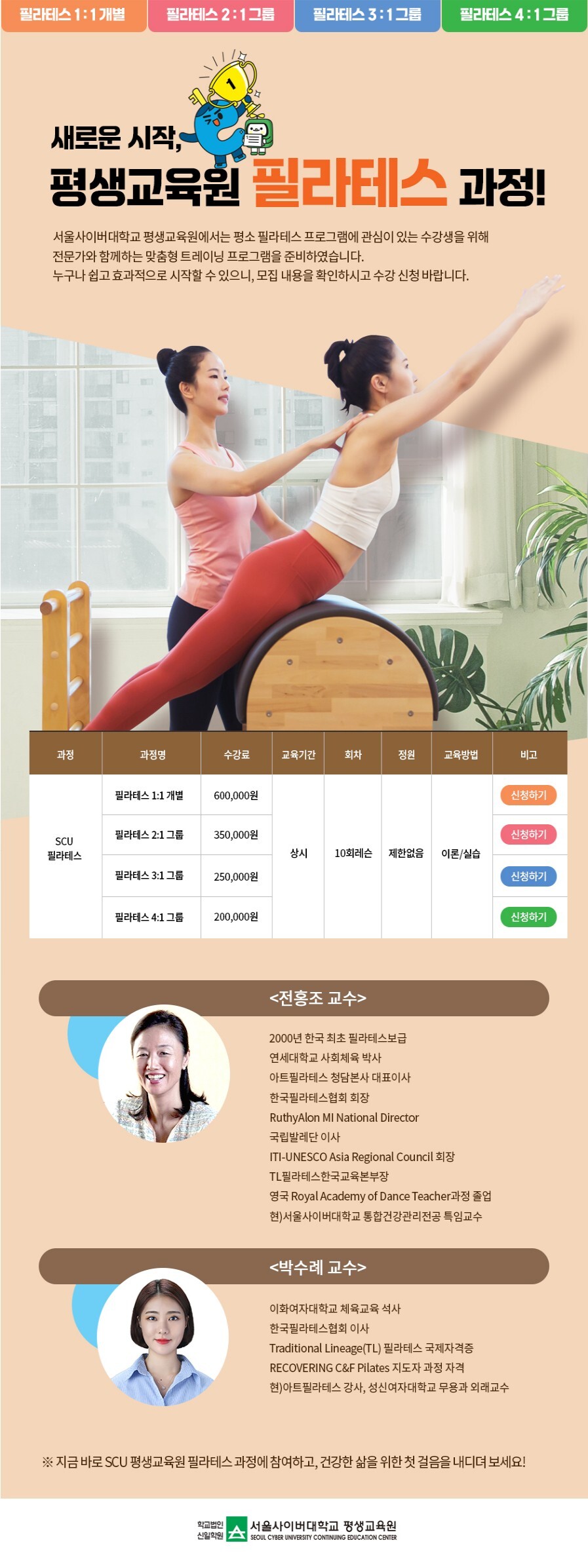 이번 ‘SCU 필라테스’ 프로그램은 ▲필라테스 1:1 개별 ▲필라테스 2:1 그룹 ▲필라테스 3:1 그룹 ▲필라테스 4:1 그룹 등으로 구성, 10회차에 걸쳐 이론과 실습 교육으로 전홍조 교수와 박수례 교수가 진행한다.