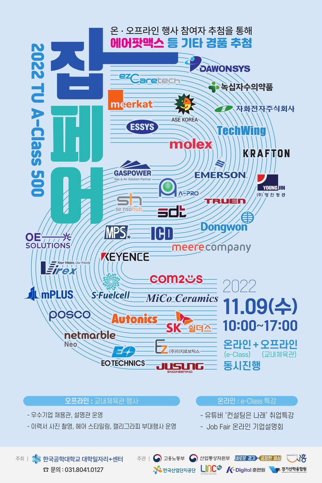 이번 잡페어 행사에는 한국공대 취업 우수기업 네트워크인 A-Class 500의 대기업, 중견기업, 외국계 등 우수기업 35개 기업이 참여한다.