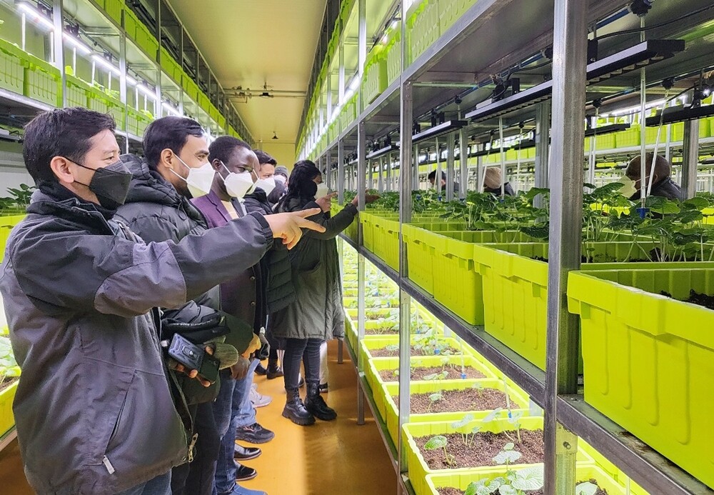 지난해 한국국제협력단(코이카) 농업생산성 석사학위과정 연수생 33명이 경북 문경시 LED식물공장을 방문해 친환경 수직형 상토 식물 공정을 체험하고 있다. 사진=경북대 제공 |