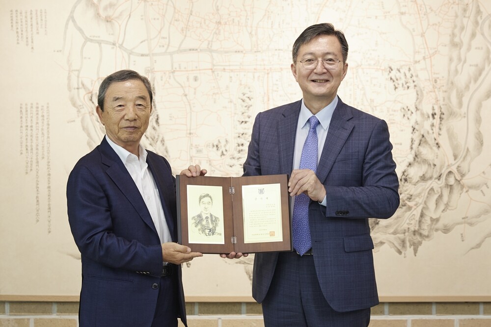 유홍림 총장과 김경일 회장(왼쪽)이 기념촬영을 하고 있다. 사진=서울대 제공