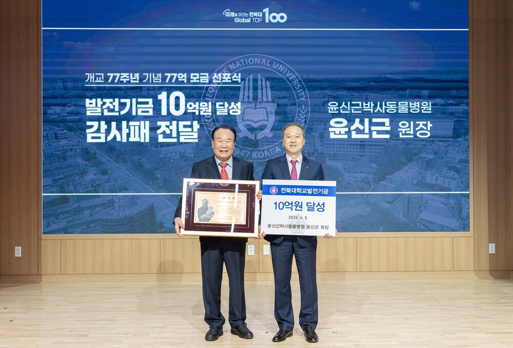 윤신근 윤신근박사동물병원장(왼쪽)이 모교인 전북대에 모두 11억 원을 기부했다. 사진=전북대 제공 |