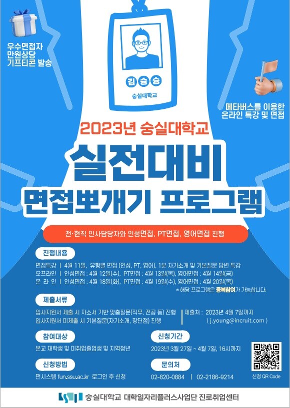 5일 숭실대에 따르면 실전대비 면접뽀개기 프로그램은 기업의 다양한 유형별 면접 전형에 대한 궁금증을 해소하고, 실전에 대비하도록 지원하는 모의 면접 프로그램이다.