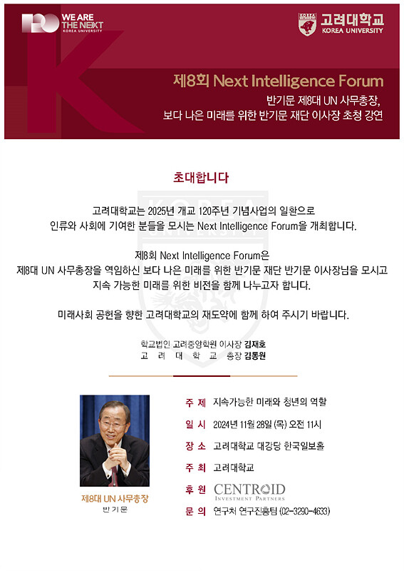 이날 강연과 함께 반기문 제8대 UN 사무총장은 고려대 학생들과 만나 심도있는 질의 응답을 이어갈 예정이다.