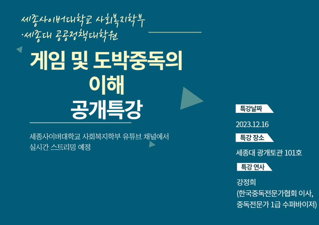 세종사이버대 사회복지학부와 세종대 공공정책대학원이 공동 주최하는 ‘게임 및 도박중독의 이해’ 특강 포스터. |