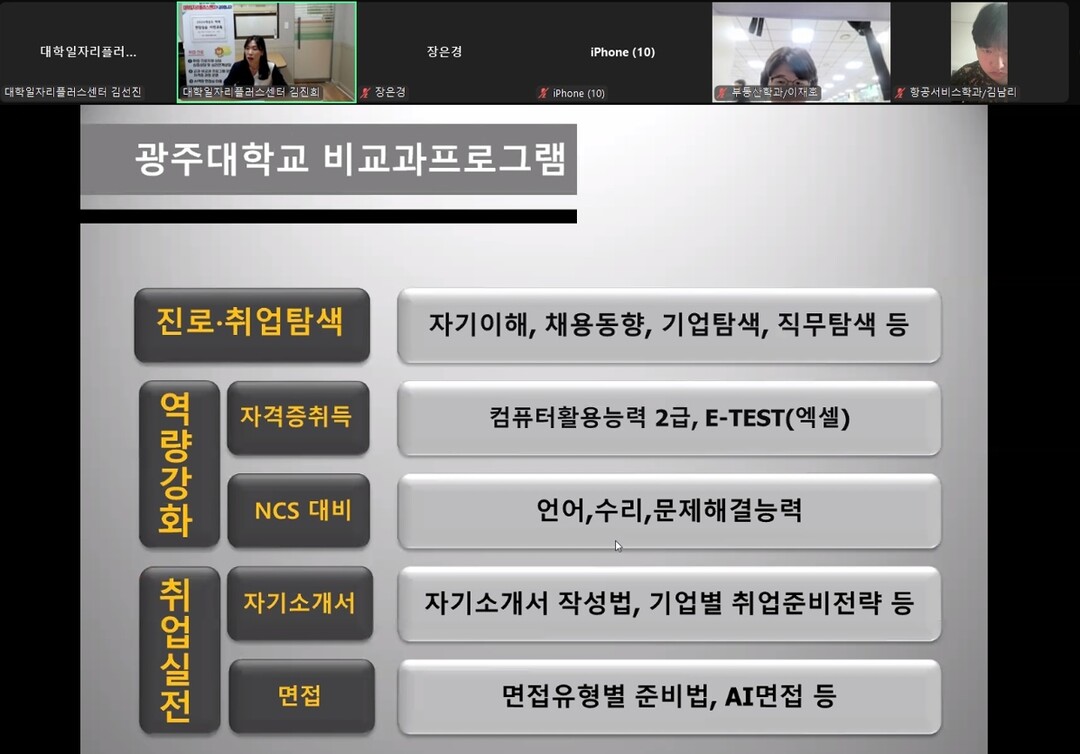 하계 현장실습생(20명)들의 현장 적응력 향상을 위해 마련된 이번 실시간 ZOOM 특강에서는 ▲대학일자리플러스센터 및 청년고용정책 이용 안내 ▲개인정보보호법 이해하기 ▲직장 예절과 비즈니스 매너를 교육했다.