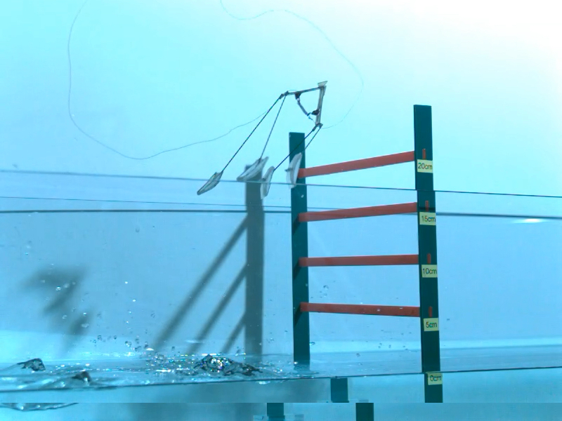 아주대 연구팀이 개발한 수면도약 로봇이 수면에서 뛰어 올라 20cm 장애물을 넘어 가는 모습. 자료=아주대 제공 |
