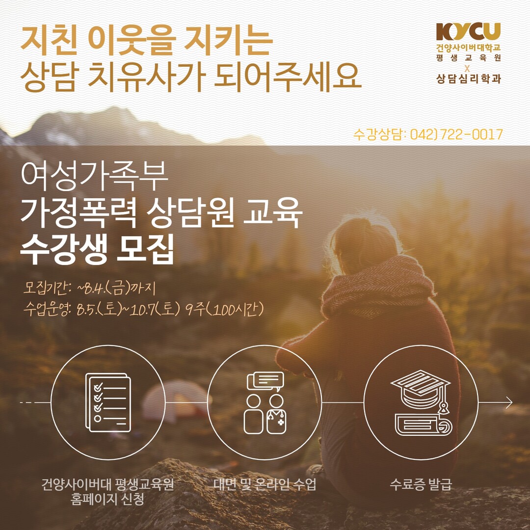 교육은 분야별 전문가를 초빙해 ▲한국 가족의 특성과 가족 문제 ▲가정폭력의 이해와 실태 ▲부부 갈등 중재 프로그램 및 심리·의료·법률 지원 등에 관해 총 100시간에 걸쳐 진행되며, 가정법원 참관 실습 등이 함께 진행된다.
