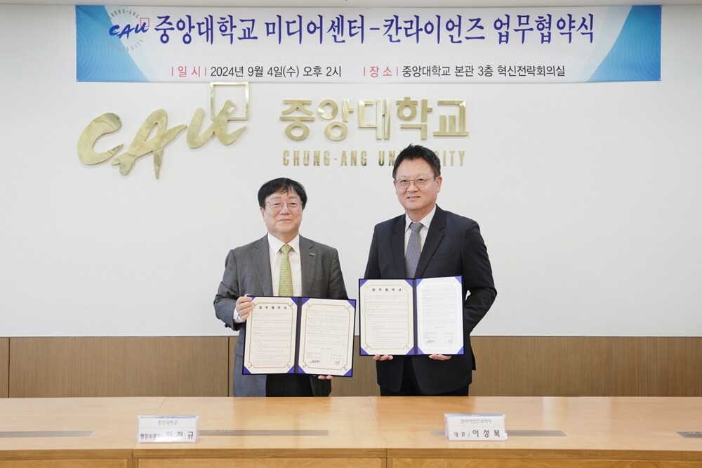 중앙대는 4일 ‘중앙대 미디어센터-칸라이언즈 업무협약식’을 서울캠퍼스 201관(본관) 3층 혁신전략회의실에서 개최했다.