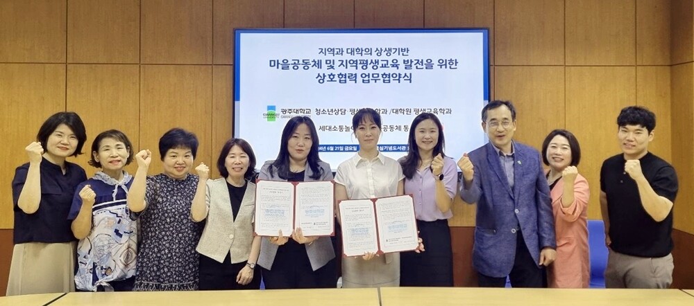 [대학저널 이선용 기자] 광주대학교 청소년상담·평생교육학과와 대학원 평생교육학과는 지난 21일 교내 호심기념도서관 5층 콜로키움실에서 세대소통놀이문화교육공동체 ‘통’과 마을공동체 및 지역평생교육 발전을 위한 상호협력 업무협약을 체결했다.