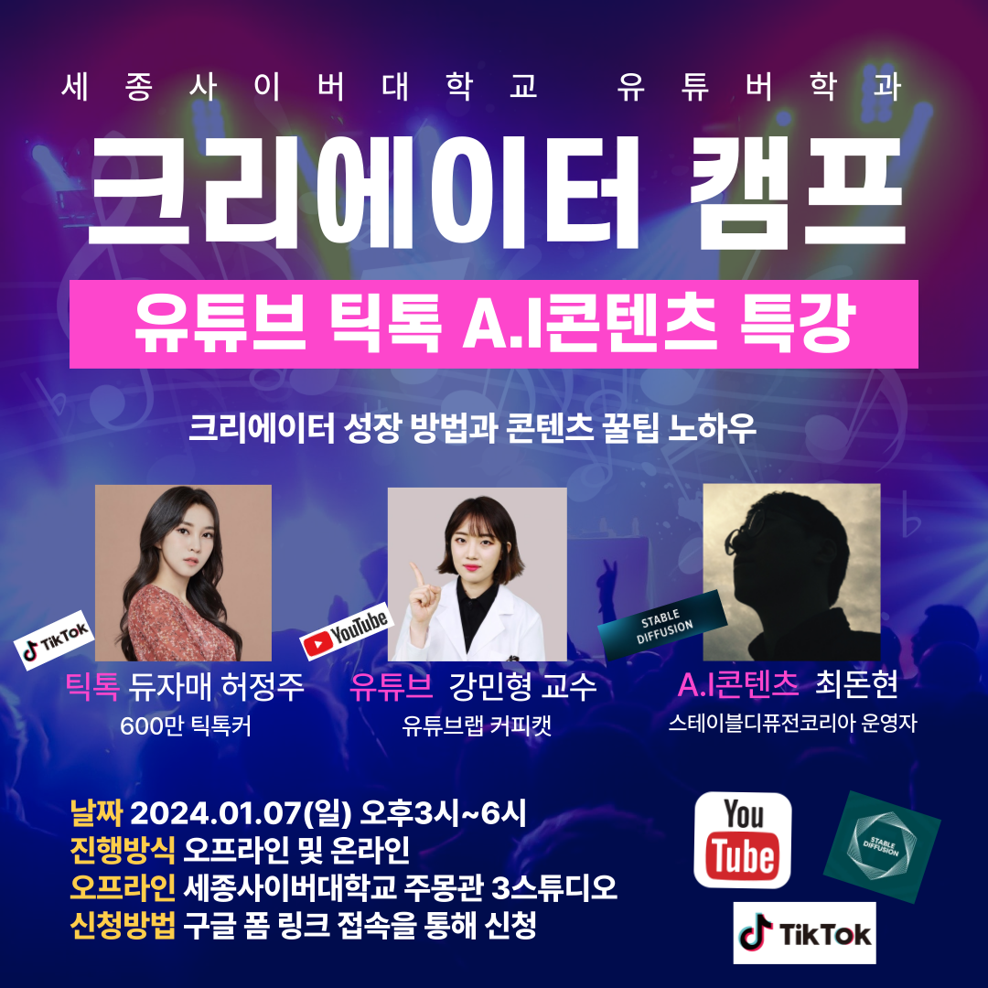 [대학저널 이선용 기자] 세종사이버대학교 유튜버학과가 1월 7일 ‘제2회 크리에이터 캠프’를 온라인과 오프라인으로 개최한다.