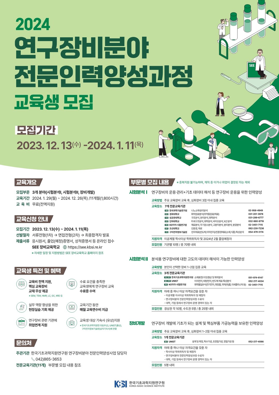 SEE 장비교육학교에서 온라인 접수를 하면 서류와 면접 전형을 거쳐 최종 교육생을 선발한다. 모집과 관련한 자세한 내용은 인하대 표준분석연구원에 전화나 이메일로 문의하면 된다.
