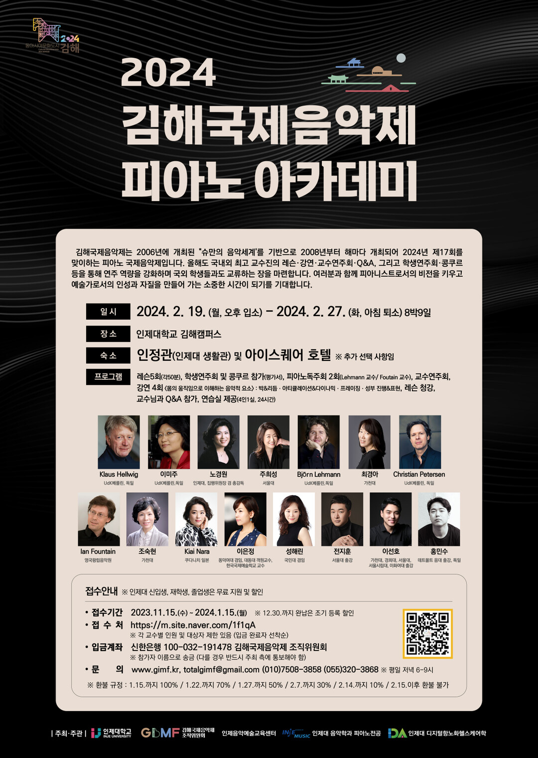 [대학저널 이선용 기자] 인제대학교에서 2월 19일부터 27일까지 ‘동아시아 문화도시 김해 2024’의 선정을 기념하며, 국내외 유명 교수진과 학생들이 참여하는 ‘2023 김해국제음악제 피아노아카데미’가 열린다.