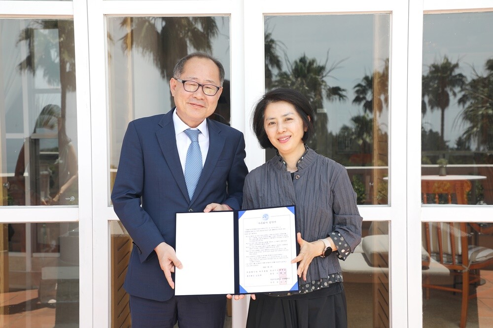 이재용 총장이 업무협약을 마치고 제주신라호텔 송승미 팀장과 기념사진을 촬영하고 있다. 사진=영남이공대 제공 |