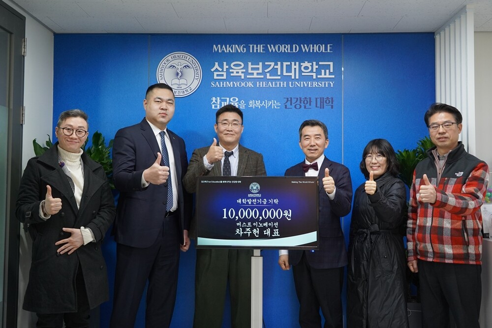 삼육보건대가 6일 (주)머스트이노베이션으로부터 대학 발전기금 1000만원을 기탁받았다. 사진=삼육보건대 제공 |