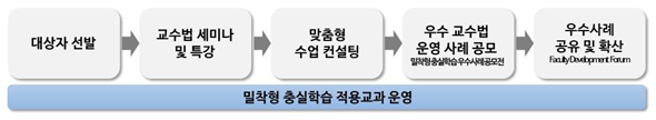 밀착형 충실학습 교수학습방법 적용 교수자에 대한 교수활동 지원 내용으로는 ▲수업 보조인력(TA) 지원(유형에 따라 1~2명) ▲교수법 세미나 및 특강 ▲교과목 유형별 맞춤형 수업 컨설팅 지원 ▲교수법 우수사례 공모전 및 우수사례 발표 참여기회 제공이 있다.