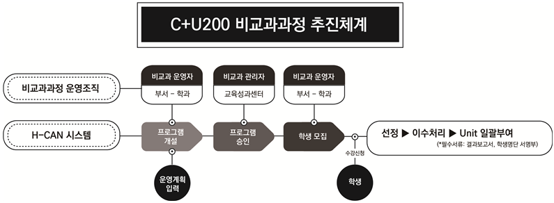 C+U200제도는 정규교과과정 130학점(Credit)과 비교과과정 70유닛(Unit)을 졸업요건화함으로써 학생들이 정규교과과정의 학습만으로는 부족한 부분을 비교과과정을 통해 보충하게 함으로써 우리 사회가 요구하는 경쟁력 있는 인재로 성장할 수 있도록 하는 제도이다.