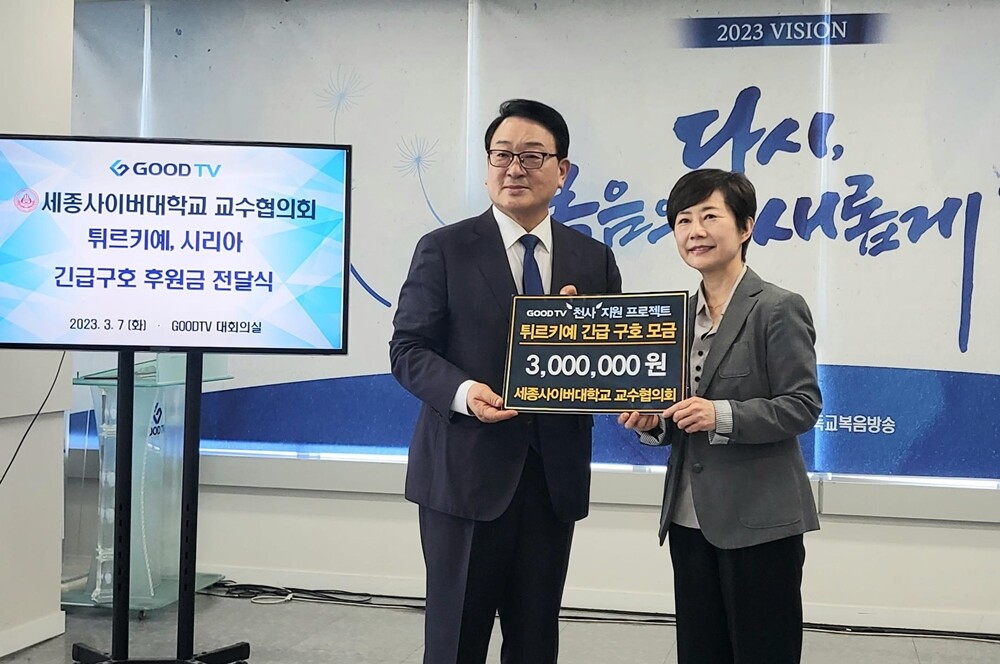 세종사이버대학교 교수협의회가 7일 튀르키예 재난민을 위한 성금을 GoodTV기독교복음방송에 전달했다. |