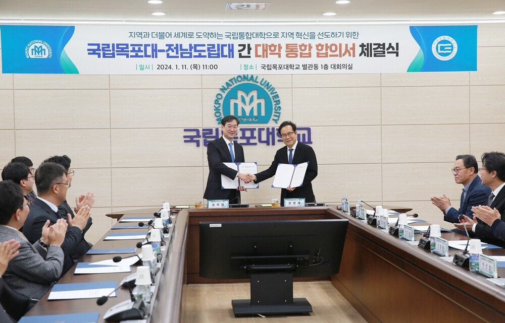 [대학저널 온종림 기자] 국립목포대학교와 전남도립대학교가 11일 국립목포대 스마트회의실에서 두 대학 총장 및 관계자가 참여한 가운데 ‘대학통합 추진을 위한 업무협약’을 체결했다.