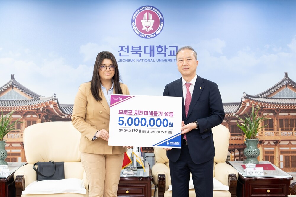 [대학저널 온종림 기자] 전북대학교 양오봉 총장을 비롯한 ‘119 보직교수단’이 최근 120년 만의 강진으로 큰 피해를 입은 모로코의 긴급 구호를 위해 500만 원의 성금을 모아 모로코 대사관에 전달했다.