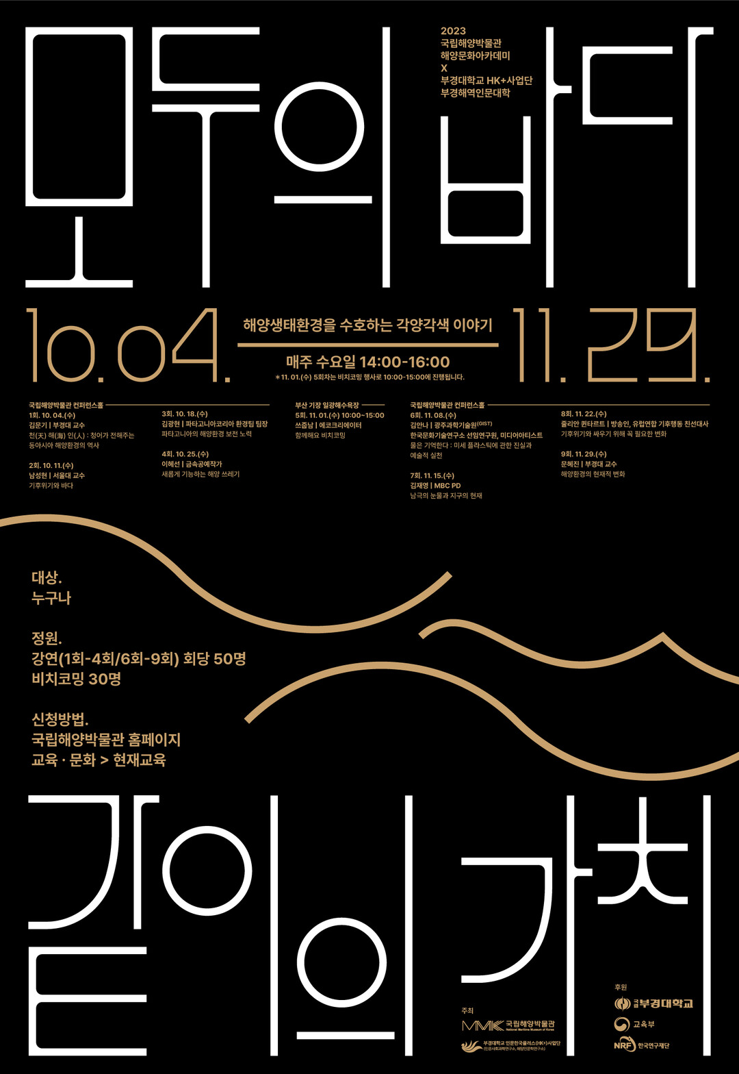 강의 주제는 ▲천(天) 해(海) 인(人): 청어가 전해주는 동아시아 해양환경의 역사(김문기 부경대 교수) ▲기후 위기와 바다(남성현 서울대 교수) ▲파타고니아의 해양환경 보전 노력(김광현 파타고니아코리아 환경팀장) ▲새롭게 기능하는 해양 쓰레기(이혜선 금속공예 작가) ▲함께 해요 비치코밍(쓰줍남 에코크리에이터) ▲물은 기억한다: 미세 플라스틱에 관한 진실과 예술적 실천(김안나 광주과학기술원 한국문화기술연구소 선임연구원) ▲남극의 눈물과 지구의 현재(김재영 MBC PD) ▲기후 위기와 싸우기 위해 꼭 필요한 변화(줄리안 퀸타르트 방송인) ▲해양환경의 현재적 변화(문혜진 부경대 교수) 등이다.