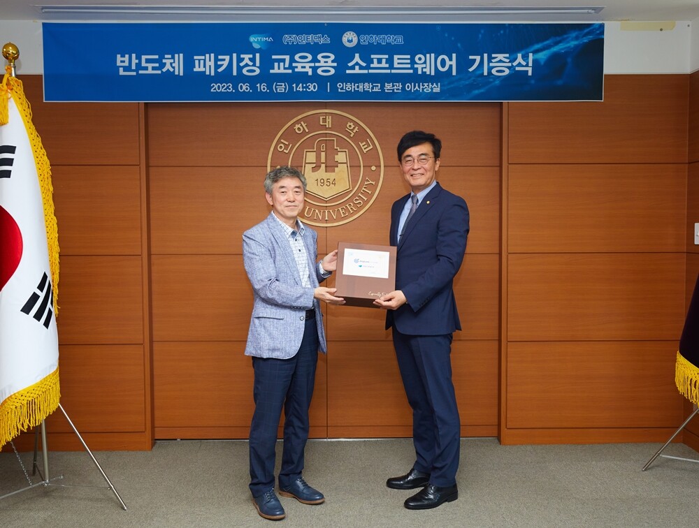 조명우(오른쪽) 인하대 총장과 박해봉 인티맥스 대표이사가 인티맥스의 소프트웨어 기증식을 한 뒤 기념촬영하고 있다. 사진=인하대 제공 |