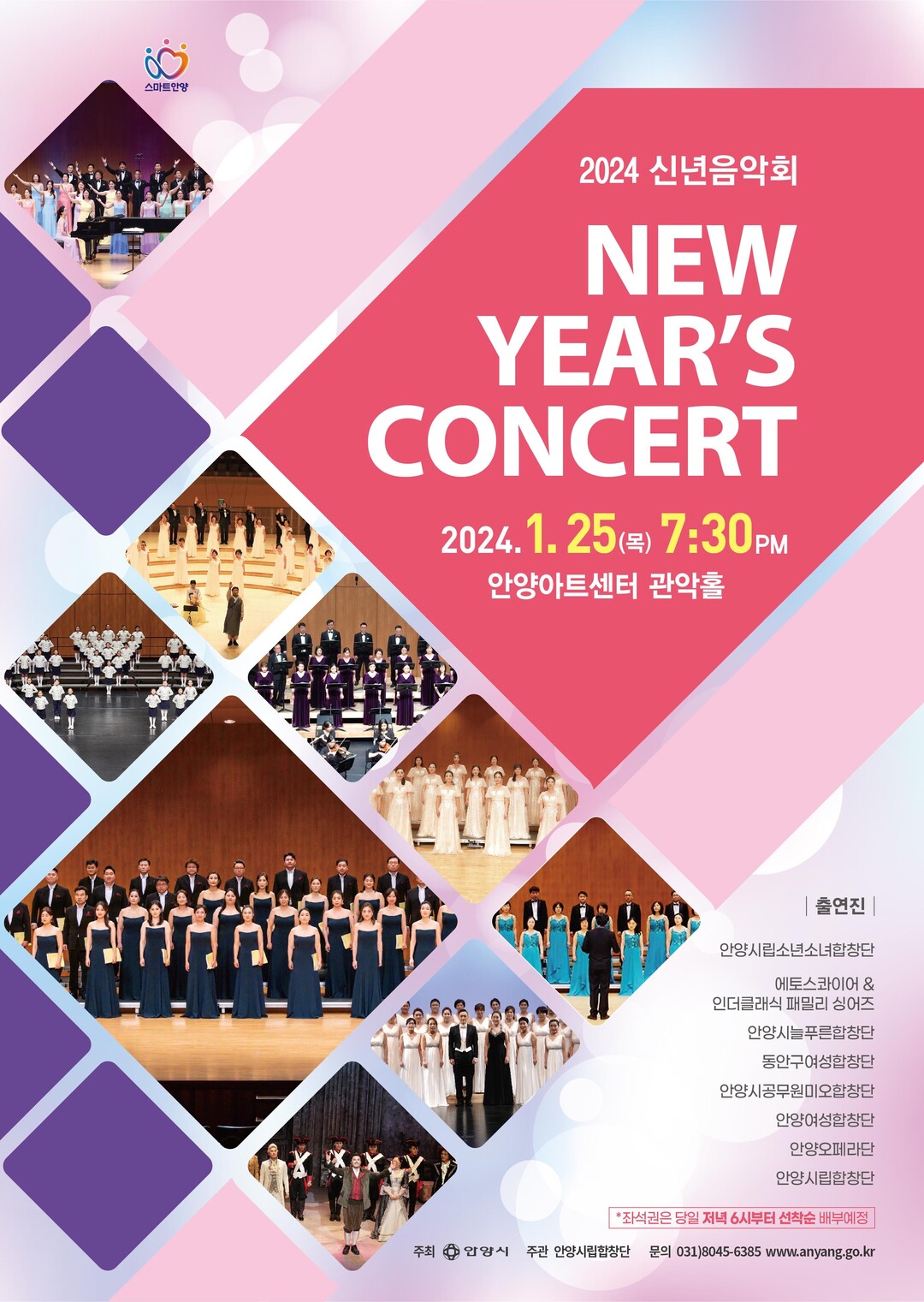 이번 2024 신년 음악회에는 안양오페라단과 안양시립합창단을 포함해 안양시립소년소녀합창단, 에코스콰이어&인터클래식 패밀리 싱어즈, 안양시늘푸른합창단, 동안구여성합창단, 안양시공무원미오합창단, 안양여성합창단 등 8개 음악 예술단체가 참여해 아름답고 웅장한 음악의 향연을 펼친다.