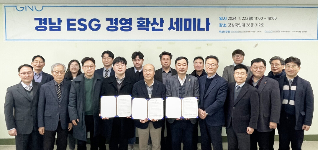 경상국립대 LINC 3.0 사업단과 지속가능발전센터, ㈜ESG경영연구원이 업무협약을 체결하고 세미나를 개최했다. 사진=경상국립대 제공 |