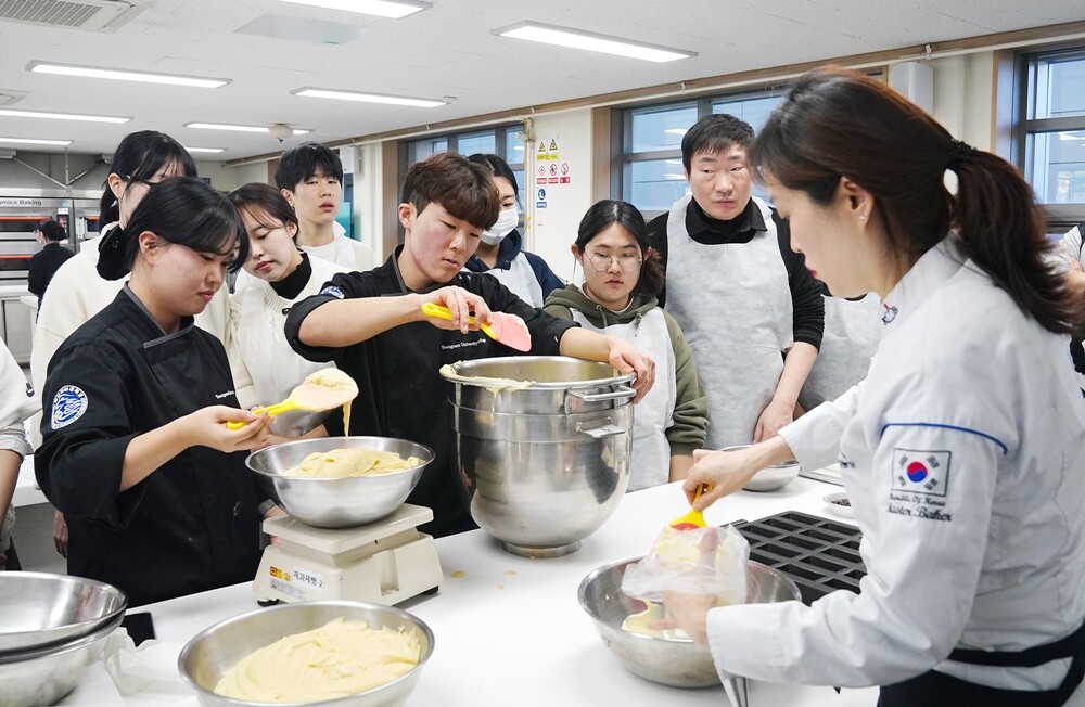 제과제빵실에서 식음료조리계열 우기남 교수와 재학생 30명이 함께 쿠키를 만들고 있다. 사진=영남이공대 제공 |