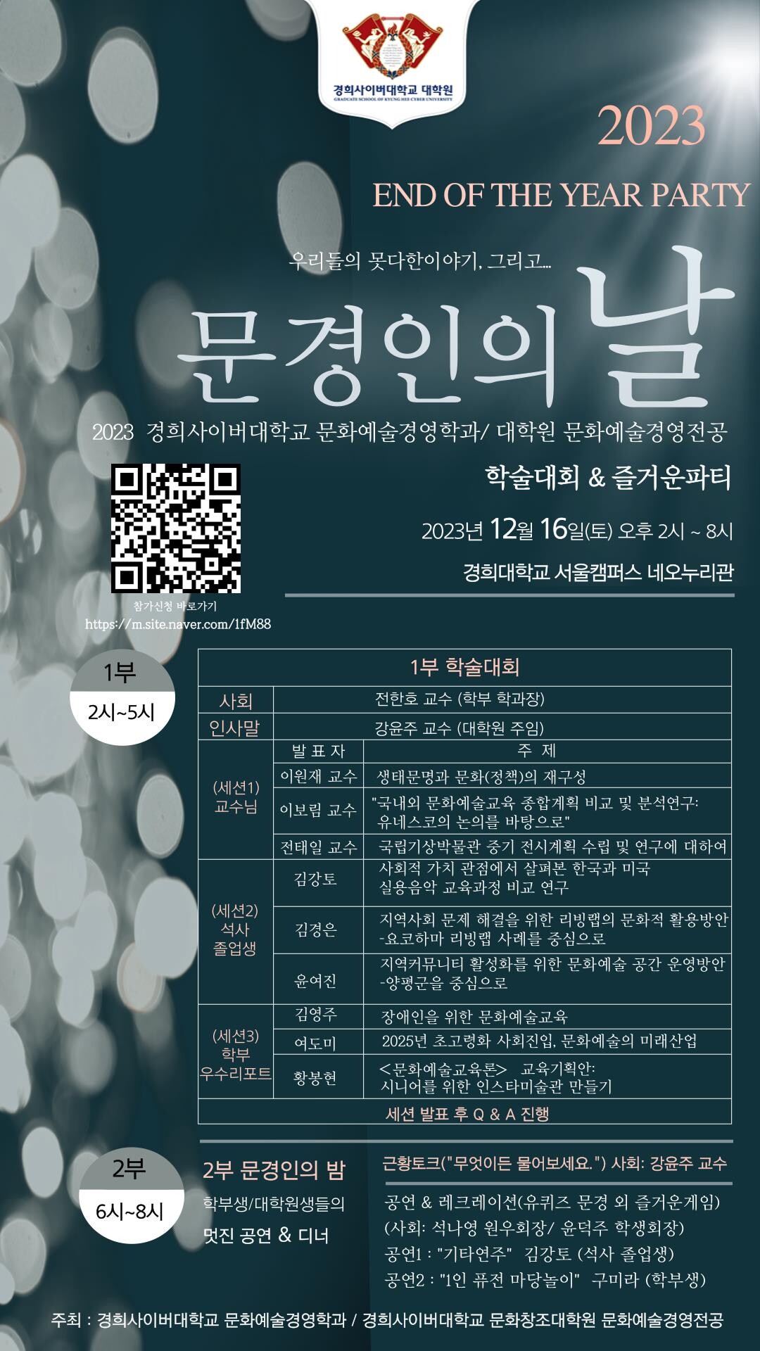 경희사이버대학교 문화예술경영학과는 이번 행사를 통해 교수, 원우 및 학부생들 간 연구 성과 공유, 연구 동향 소개, 질의응답 등을 통해 학문적 성장은 물론 인간적인 소통과 친목도 도모하는 자리가 될 것으로 기대하고 있다.