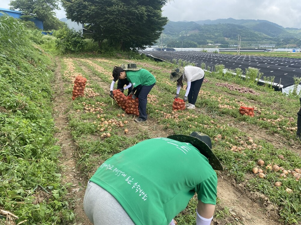 전북대 농촌봉사단 학생들이 남원 일원에서 양파 수확 등 농번기 부족한 일손 돕기를 하고 있다. 사진=전북대 제공 |