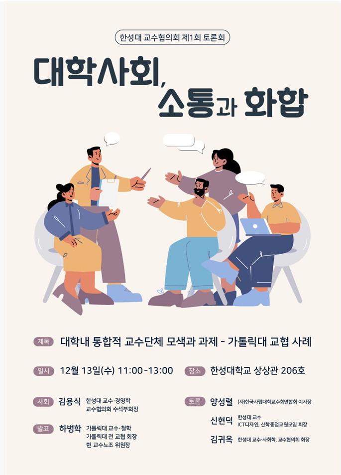 [대학저널 이선용 기자] 한성대학교 교수협의회가 12월 13일 오전 11시부터 학내 상상관 206호에서 ‘대학사회, 소통과 화합’이라는 주제로 첫 토론회를 개최한다.