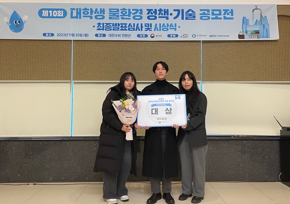 [대학저널 온종림 기자] 전북대학교 김석훈·이가현(자연과학대학 지구환경과학과)·노나은(자연과학대학 생명과학부 생명과학과) 학생으로 구성된 ‘水리부엉이’팀이 환경부가 주최한 ‘제10회 대학생 물환경 정책기술 공모전’에서 대상을 수상했다.