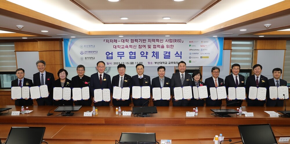 [대학저널 온종림 기자] 부산대학교를 비롯한 부산 지역 14개 국·사립대학들이 상호 협력을 강화하고 지역대학의 혁신을 통한 고등교육혁신모형을 제시하기 위한 ‘지자체-대학 협력기반 지역혁신사업(RIS) 대학교육혁신 참여 및 협력을 위한 협약’을 15일 부산대 대학본관 6층 교무회의실에서 체결했다.