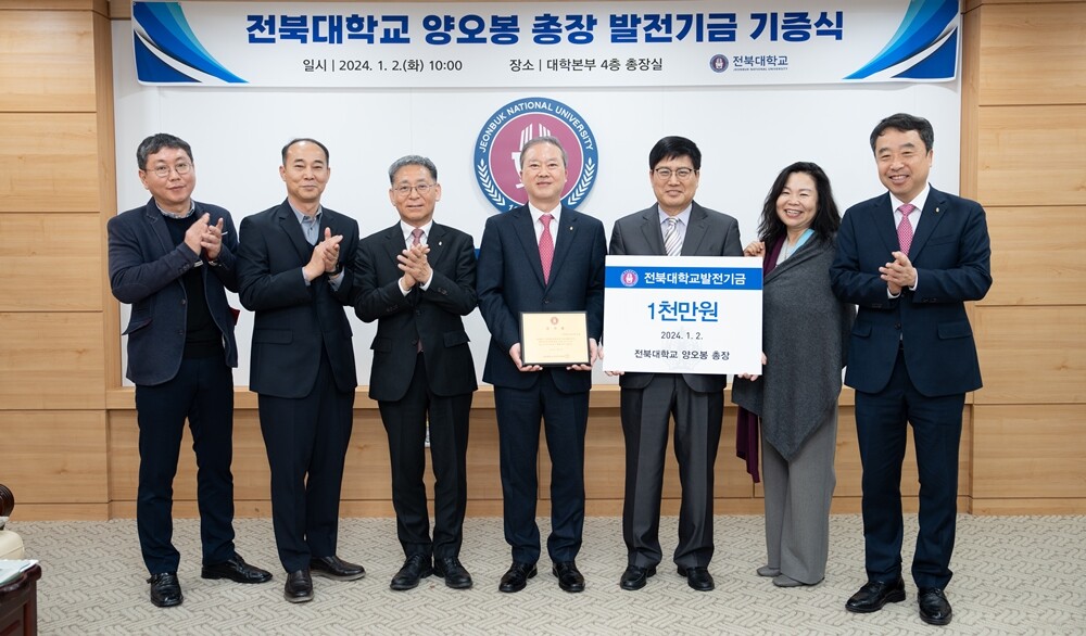 양 총장은 “학생이 있어야 우리 전북대학교가 존재할 수 있다. ‘학생의, 학생에 의한, 학생을 위한 전북대학교’를 만들기 위해 총장이 앞장선다는 의미로 새해 첫 날 의미 있는 기부를 했다”며 “글로컬대학30 사업을 위한 담대한 여정에 나서는 우리 전북대학교에 혁신 동력이 되길 바란다”고 말했다.