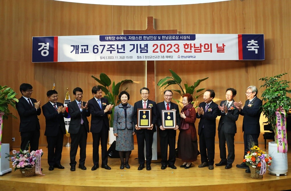 [대학저널 온종림 기자] 한남대학교가 지난 3일 정성균선교관에서 개교 67주년 기념 ‘2023 한남의 날’ 행사를 개최하고, 한남대 학교법인 대전기독학원 우영수 前 이사장과 이수민 석좌교수에게 대학장을 수여했다. 또 5명의 동문에게 ‘2023 자랑스러운 한남인상’을 수여했다.