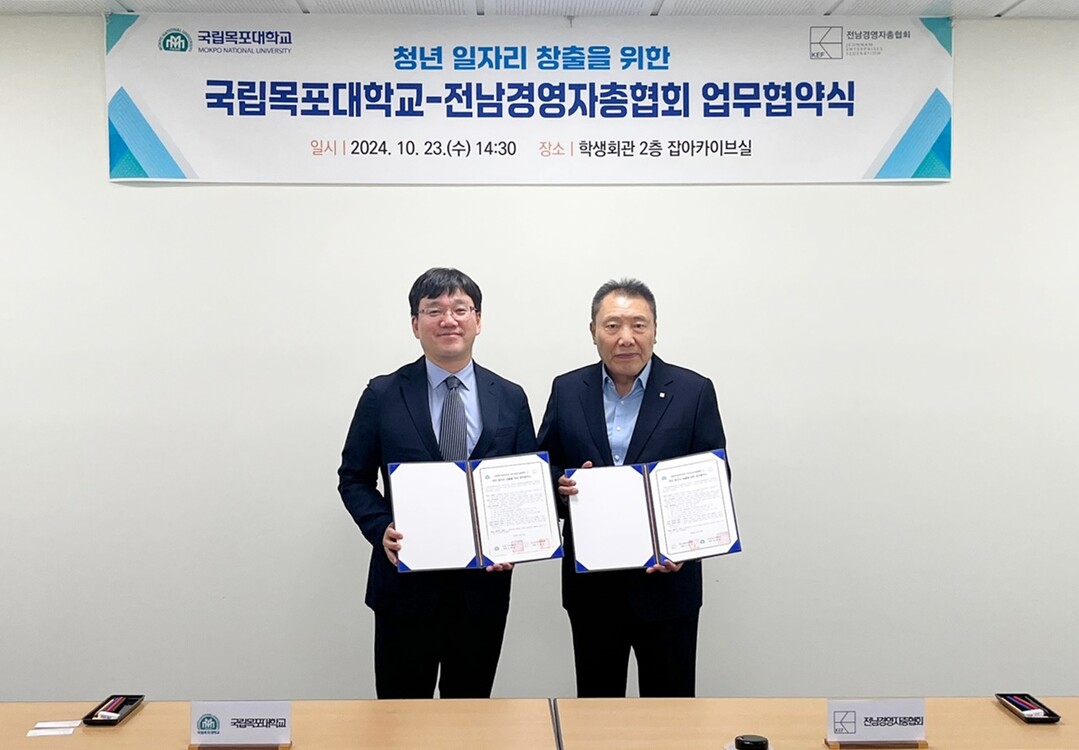[대학저널 이선용 기자] 국립목포대학교는 지난 10월 23일 오후 2시 30분 국립목포대 학생회관 2층 잡아카이브실에서 전남경영자총협회와 일자리 창출 및 취업 활성화를 위한 업무협약을 체결했다고 24일 밝혔다.