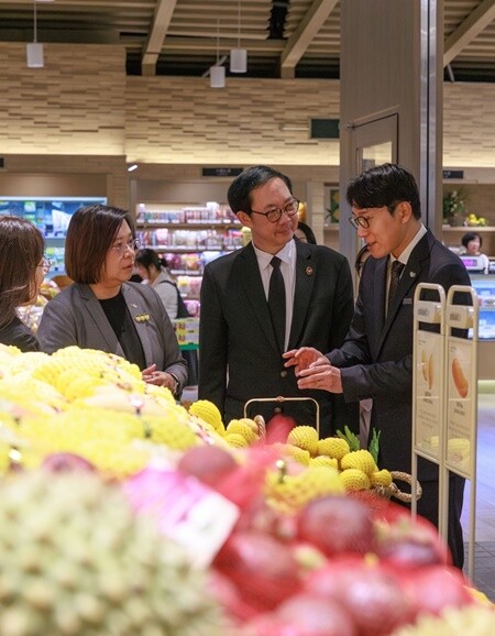주한태국상무공사관과 현대백화점이 함께 개최하는 'Taste of Thailand 2026' 프로모션에서 3명의 관계자가 태국산 프리미엄 망고를 선보이고 있다. 왼쪽부터 현대백화점 더현대 서울 식품팀 양재모 수석, 주한태국대사관 차와돈 나파탄논 공사, 주한태국상무공사관 싸이텅 써이펫 상무관. |