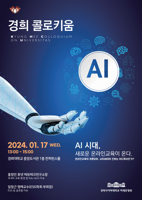 이번 경희 콜로키움은 ‘AI 시대, 새로운 온라인교육이 온다’라는 주제로 대학의 미래 가치 공유와 오늘의 이슈를 공감하고 소통하는 자리가 될 것으로 기대하고 있다.